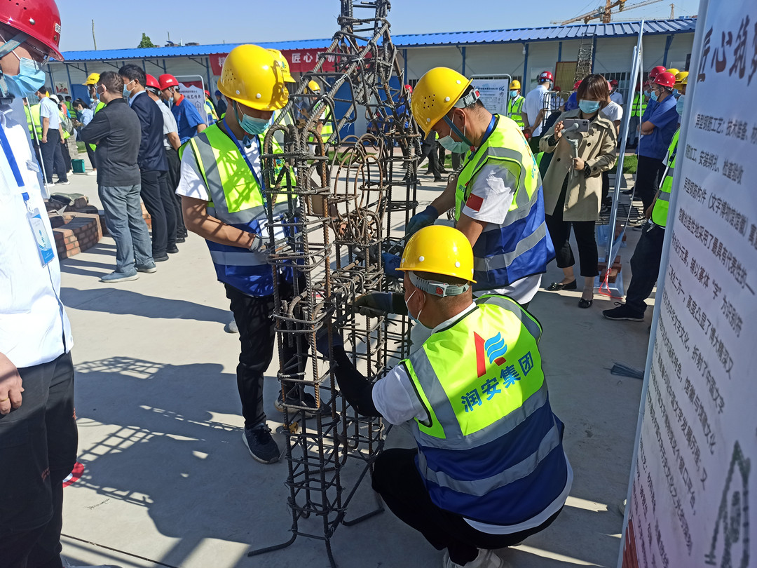 本次技能展示活動設(shè)置了鋼筋綁扎和砌筑兩個項目,我公司派遣八名職工代表參加了本次技能展示,選手們身著統(tǒng)一工作服,以嫻熟的操作技能展現(xiàn)了過硬的技術(shù)水平。砌筑工速度與質(zhì)量并重,一手拿著泥刀,一手不停地一塊塊砌磚,每一道工序、每一個細節(jié)都力求做到完美,最終圓滿完成了砌筑作品《文字博物館》。鋼筋工粗中有細,在大面積作業(yè)的同時,即時進行細節(jié)處理,確保作品垂直、平整,經(jīng)過一系列的復(fù)雜操作,一個完美的安陽文字博物館館徽便呈現(xiàn)在眼前。高超的技藝水平贏得了領(lǐng)導(dǎo)和現(xiàn)場觀眾的一致稱贊。